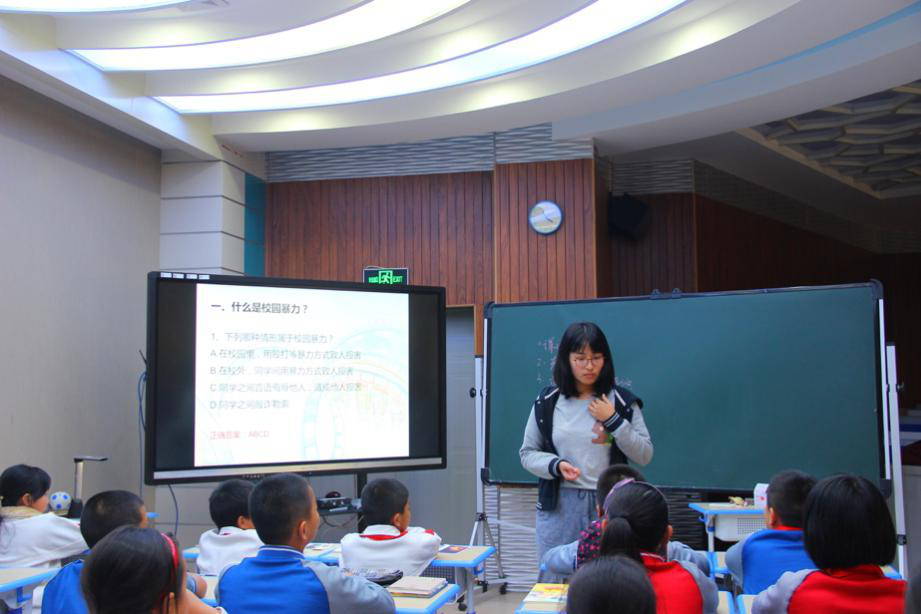 担任本次授课的司法行政志愿者为厦门大学法学院2016级民商法硕士研究生徐彦婷同学,她以“对校园暴力说不”为主题,从校园暴力的概念、校园暴力的表现形式、校园暴力的危害及其法律代价,针对校园暴力的应对措施角度,以理论与现实相结合、问答互动的方式,为同学们生动地阐释了校园暴力的相关法律问题。授课老师也为踊跃回答问题的同学,送上了精心准备的厦大纪念品。