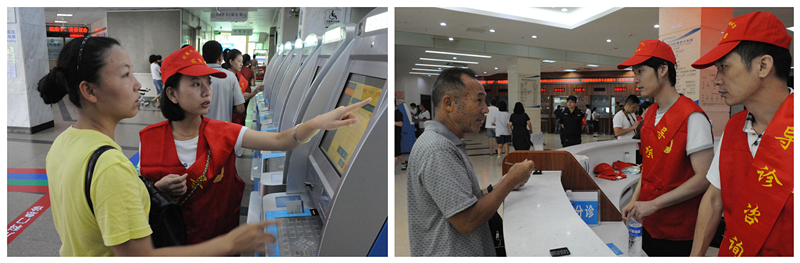 医院门诊大厅是志愿者的“主战场”,这里来往的患者多,需要各种各样的帮助。志愿者们帮助患者自助挂号预约、取药、指路,为老弱及行动不便的患者提供就医导诊。