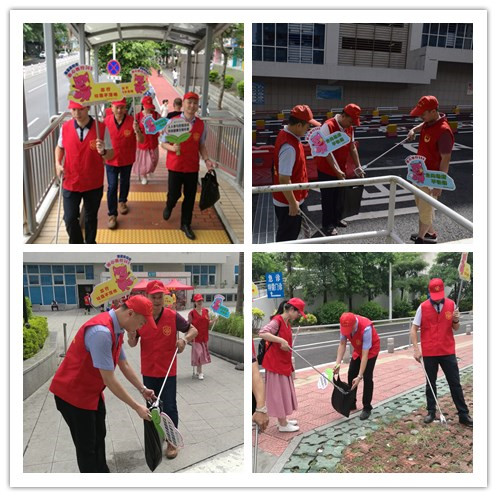 在医院院区楼层、中庭花园等区域,有的志愿者手拿钳子和垃圾袋,捡拾烟头、纸屑等;有的开展垃圾分类及控烟宣传,劝阻吸烟等不文明行为;有的发放《垃圾分类宣传手册》,共同维护干净整洁、文明和谐的就医环境。