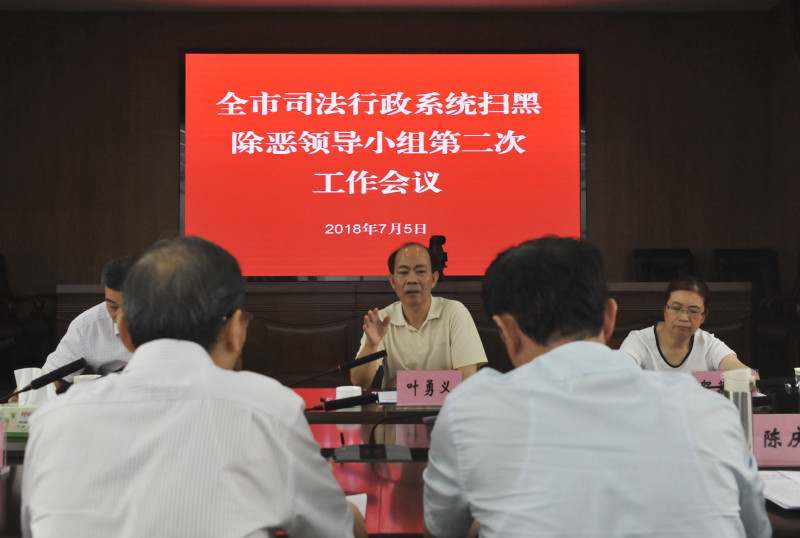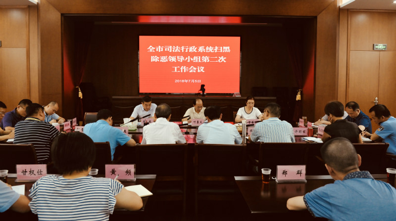 7月5日,市司法局召开全市司法系统扫黑除恶领导小组第二次会议,传达市扫黑除恶专项斗争领导小组第四次组长会议精神,分析研判工作中存在的问题,研究讨论下一阶段工作方案。市司法局局长叶勇义、副局长贺菊英、副局长兼市强戒所所长唐乾,局机关律管、社矫、基层、普治、法律援助中心等相关处室负责人、各区司法局局长、市律师协会扫黑除恶案件刑事辩护指导小组成员参加了会议。唐乾副局长首先传达了市扫黑除恶专项斗争领导小组第四次组长会议精神。贺菊英副局长随后了分析各部门前阶段工作中存在的问题并部署下一阶段任务。最后,叶勇义局长就深入推进扫黑除恶工作提出三点要求:一是要提升政治敏感性,准确把握政治方向,要站在习近平总书记提出的“以人民为中心”的理念的高度,坚定开展扫黑除恶专项斗争的信心和决心;二是要压实工作责任,各部门要按照市扫黑除恶专项斗争领导小组重点工作部署,围绕“六个突出”抓紧开展台账整理工作;三是要突出工作重点,要在对重点人群日常管控,戒毒、社矫人员线索逐一摸排,法律服务工作者合法合规办案,在征地拆迁等容易滋生黑恶势力的地方加强法制宣传等方面再下工夫,抓好线索摸排,做好典型案例示范,形成舆论氛围,扎实推进扫黑除恶斗争工作。